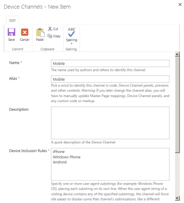Device channels are set up using different user agent strings and separate master pages based on these. For user agent strings, you can use just parts of the string, for example “Windows Phone”, “iPhone”, etc. In addition to separate master pages, it is now possible to target content based on the device channels you have defined.