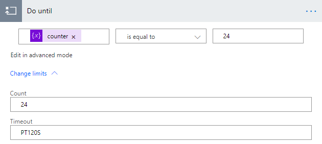 For this example, I have hard coded the number of times the loop should run, but in real life this would be a parameter coming in to the flow. In more detail, for the Do Until step we set the limits (as an example) of the loop to a max count of 24 and a timeout of PT120S (120 seconds according to ISO 8601):