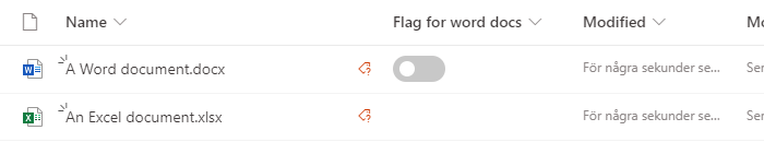 The requirement was that they wanted to show this toggle button (setValue custom row action) only if the file type is a Word document (.docx).
